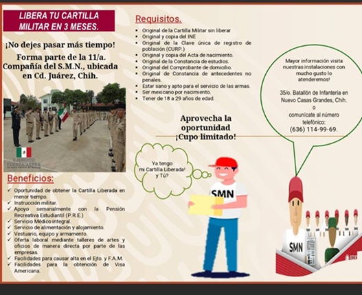 Asimismo, los interesados podrán cumplir con el Servicio Militar Nacional de manera encuadrada, en la 11/a Compañía del Servicio Militar Nacional, ubicada en Cd. Juárez, Chihuahua.